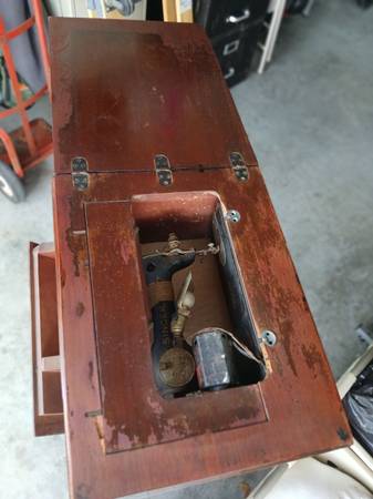 Phone calls only. If posted its available. Sewing machine w/cabinet on casters. Do not know if it works. Cords will have to be replaced. Salvage/fair condition. Nice decor piece for the price....