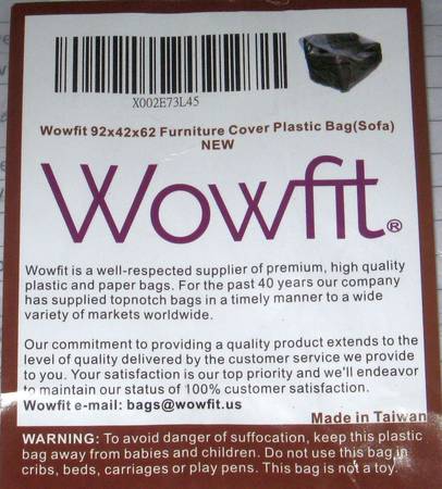 Used briefly once: 8' by 2' by 3.5' clear plastic cover or bag that will hold a large couch or other big piece of furniture. No tears or holes.