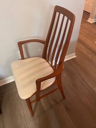 Danish MCM Teak Dining chairs a set of 4 total, 2 side chairs and 2 arm chairs by Koefoed. The table was purchased at that time.. Call