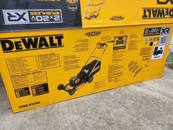 BRAND NEW, never used, Dewalt 2 x 20-Volt Battery Powered Self-Propelled Lawn Mower Kit. This kit includes two batteries, two chargers, a rear grass bagger, a rear side discharge chute, and a mulch plug. This model is rear wheel drive and has a high efficiency cutting system with dual blades. The one touch handle system easily changes from storage mode to operating mode. Its space-saving design allows you to fold the handle down and stand the mower upright. The LED dashboard on the handle shows you the batteries state of charge and allows you to adjust the variable speed self-drive. There is a single point height adjustment with 6 positions to adjust your deck height. This model retails for $729 +tax. Save over $200 here!!